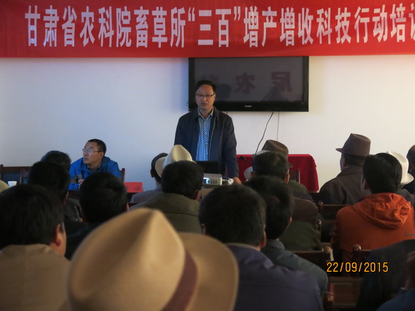 9月21-24日,畜草所董俊副研究员带领项目组成员赴卓尼县开展了“三百”、“三区”科技培训,卓尼县农牧局副局长孙志俊、卓尼县科技局局长杨和平、县动物疫控中心主任王延平陪同项目组人员参加了培训会。董俊副研究员针对当地畜牧业发展中存在主要问题做了“肉牛高效养殖与疫病防控技术”的专题培训,本次培训集中了卓尼县柳林镇、木耳乡、纳浪乡、藏巴哇乡、大族乡、申藏乡、恰盖乡、康多乡、阿子滩乡、完冒乡、扎古录乡、刀告乡、尼巴乡等17个乡镇的从事畜牧兽医工作的技术骨干50多名,取得了良好的效果。